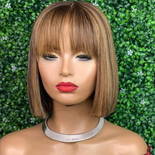 Highlight Brown Straight Bob Wig With Bangs Glueless Human Hair Wig With Fringe