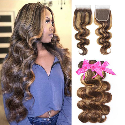 Highlight Brown P4/27 Body Wave Human Hair 3 Bundles With Lace Closure