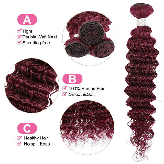 99J Deep Wave 3 Bundles With Closure Virgin Burgundy Human Hair Bundles With Closure