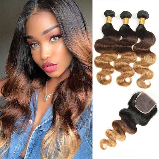 T1B/27 Ombre Honey Body Wave Hair 3 Bundles With Closure Human Hair With Dark Roots