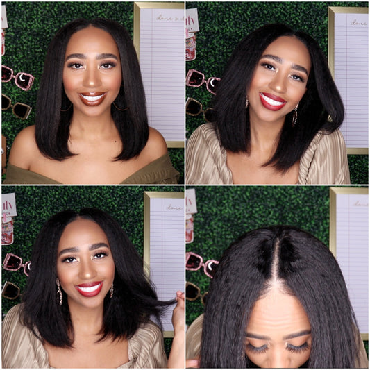 Thin V Part Wig Kinky Straight Bob Human Hair Wigs Without Leave Out