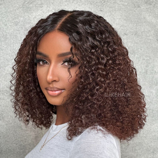 Glueless Reddish Brown With Dark Root Bouncy Curl Lace Wig
