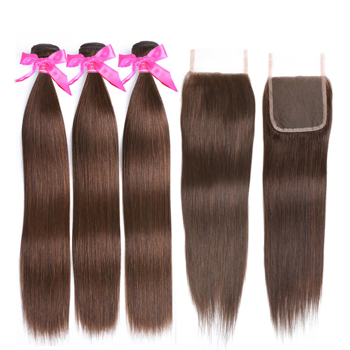 #4 Light Brown Straight Hair 3 Bundles With Closure 100% Human Hair Bundles