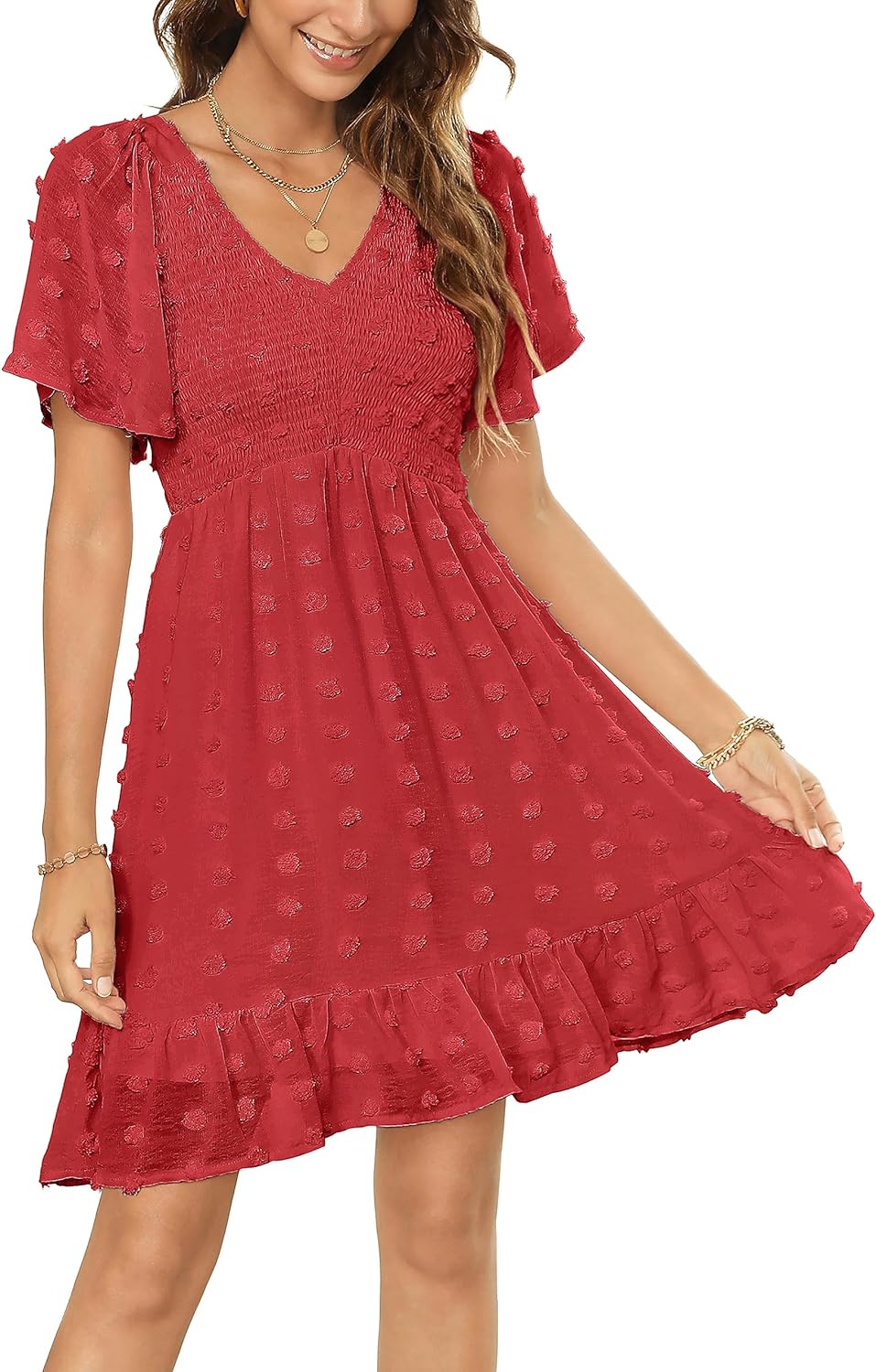Zattcas Womens 2024 Summer Smocked Dress Short Flutter Sleeve V Neck Swiss Dot Babydoll Ruffle Tiered Mini Dress